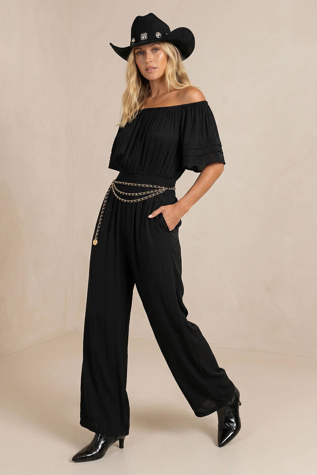 Slip into effortless elegance with this off-the-shoulder jumpsuit that's ready for anything. The relaxed wide-leg silhouette pairs perfectly with a gathered elastic waist that hugs you just right, while delicate cap sleeves bring a flirty, sophisticated vibe. Whether you're heading to brunch, a garden party, or a casual night out, this jumpsuit delivers that coveted "I woke up like this" charm without any of the fuss.