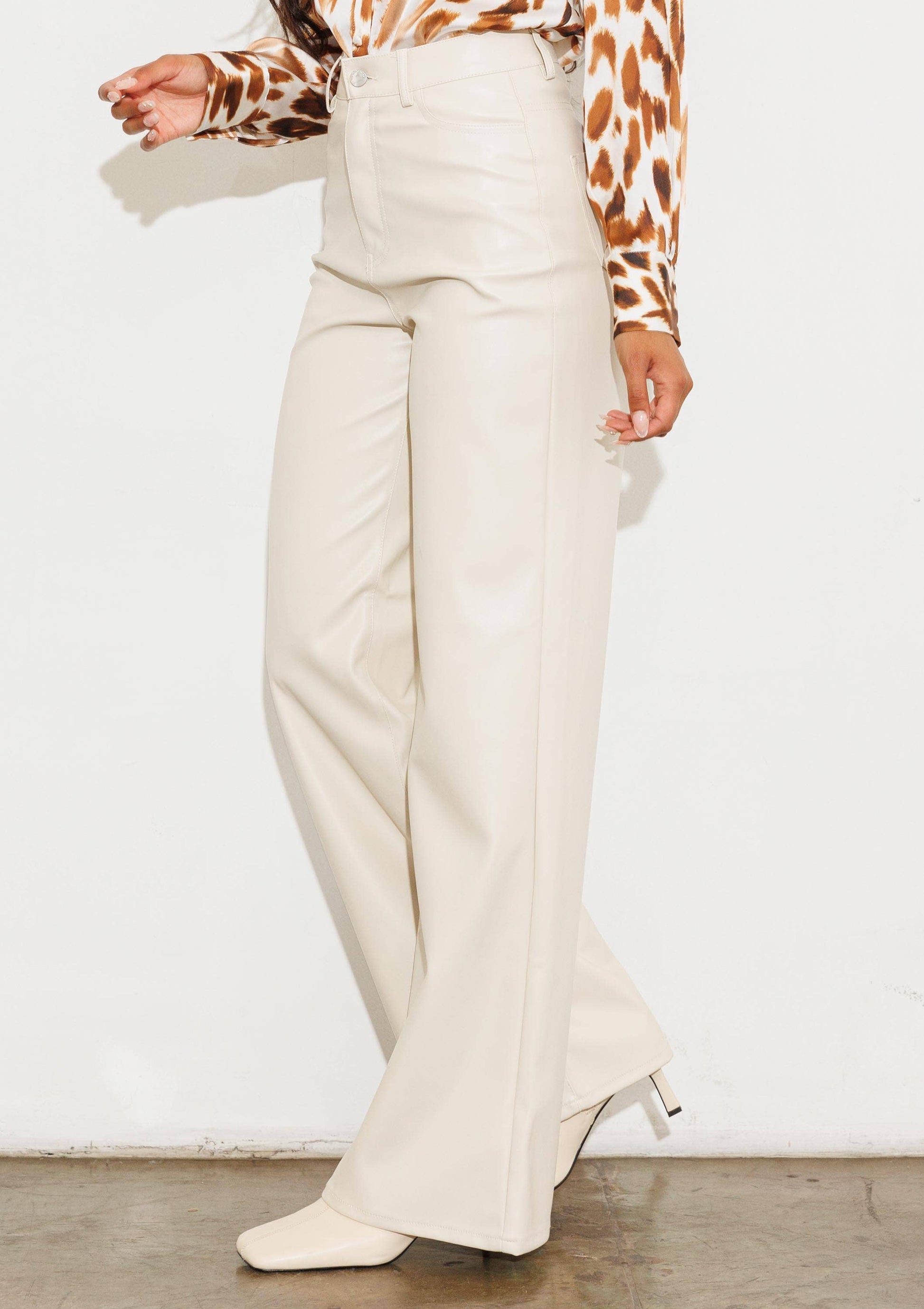 Elevate your wardrobe with these Vegan Black Leather Wide Leg Pants, expertly designed for a refined silhouette. Crafted from high-quality vegan leather, they offer a luxurious feel while maintaining ethical standards. The wide-leg cut provides effortless movement and modern sophistication, complemented by practical details including two front and two back pockets. A smooth zip-fly closure ensures a polished finish, making these pants a versatile piece for both day and evening wear.